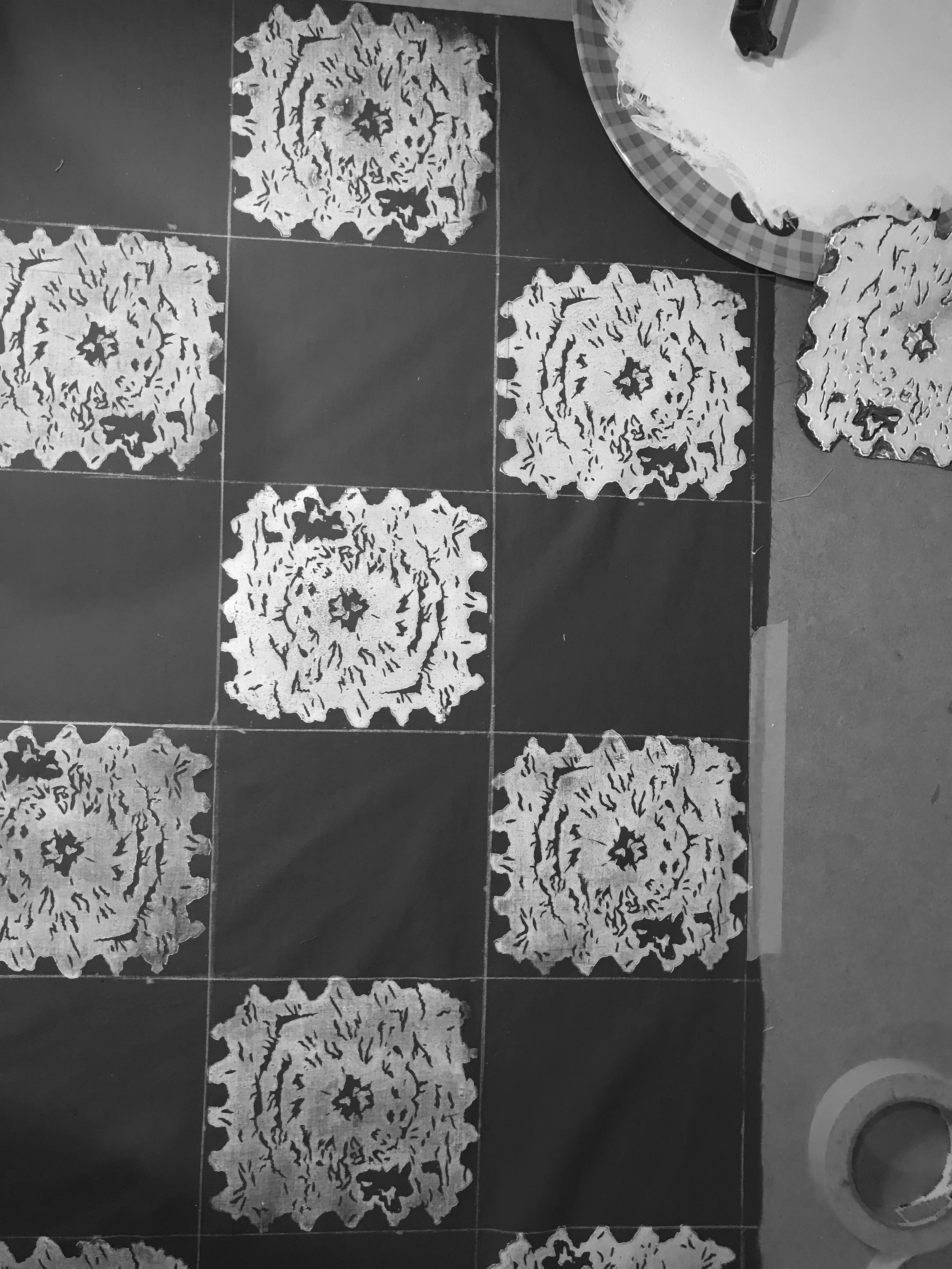 I carved a linocut stamp inspired by crochet granny squares, then used it to create a checkerboard-style print.